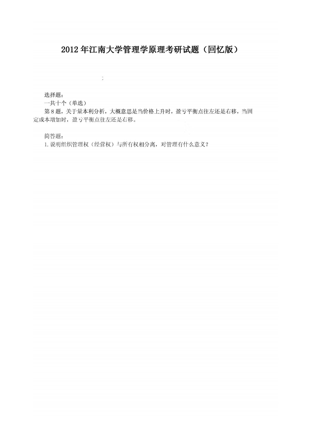 江南大学823管理学原理2012年真题回忆版