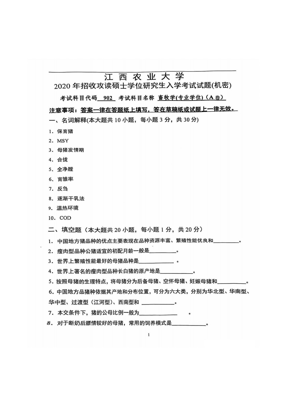 江西农业大学902畜牧学2020年真题