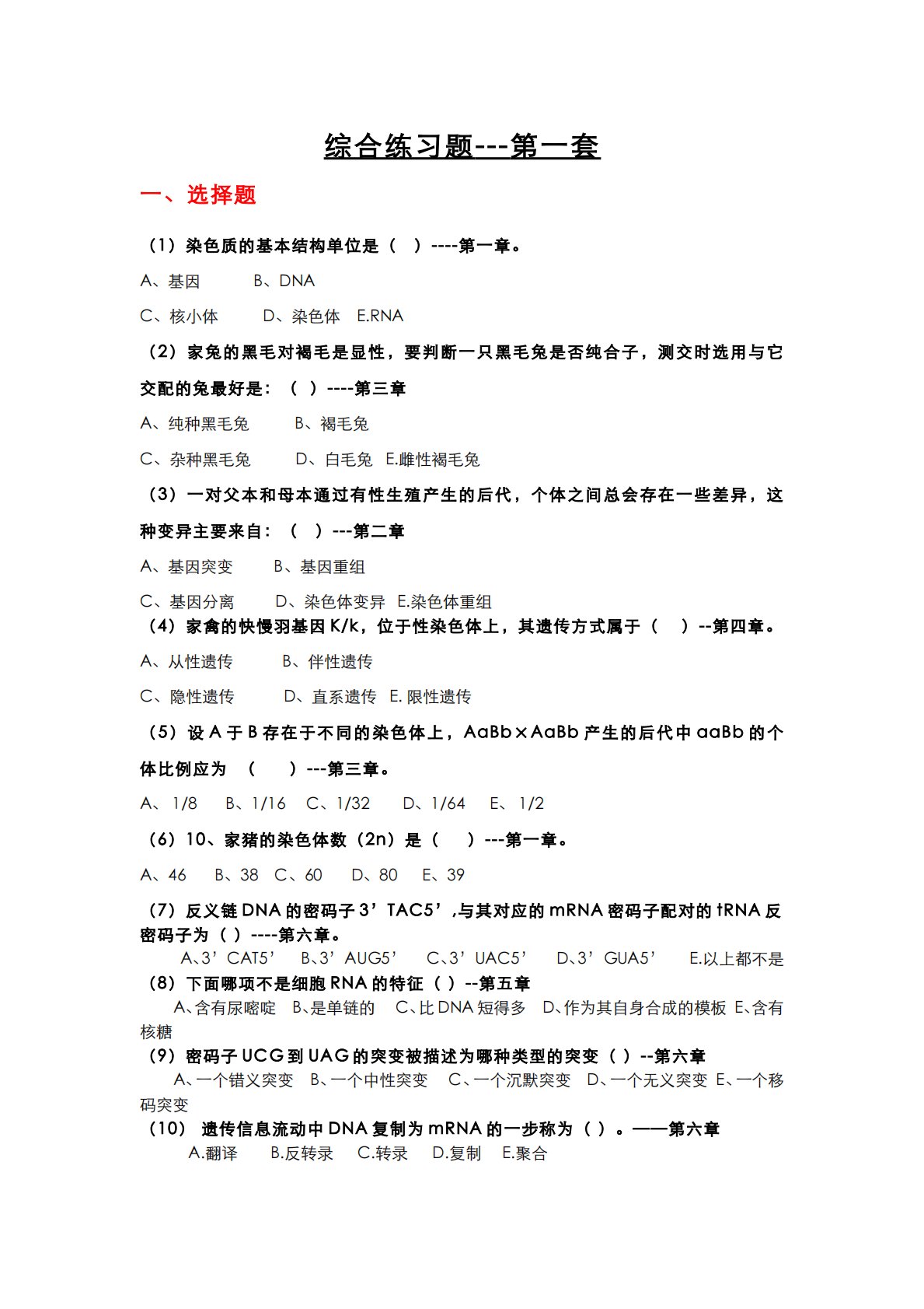 综合练习题---第一套一、选择题(1)染色质的基本结构单位是()----第一章。A、基因B、DNAC、核小体D、染色体E.RNA(2)家兔的黑毛对褐毛是显性,要判断一只黑毛兔是否纯合子,测交时选用与它交配的兔最好是:()----第三章A、纯种黑毛兔B、褐毛兔C、杂种黑毛兔D、白毛兔E.雌性褐毛兔(3)一对父本和母本通过有性生殖产生的后代,个体之间总会存在一些差异,这种变异主要来自:()---第二章A、基因突变B、基因重组C、基因分离D、染色体变异E.染色体重组(4)家禽的快慢羽基因K/k,位于性染色体上,其遗传方式属于()--第四章。A、从性遗传B、伴性遗传C、隐性遗传D、直系遗传E.限性遗传...