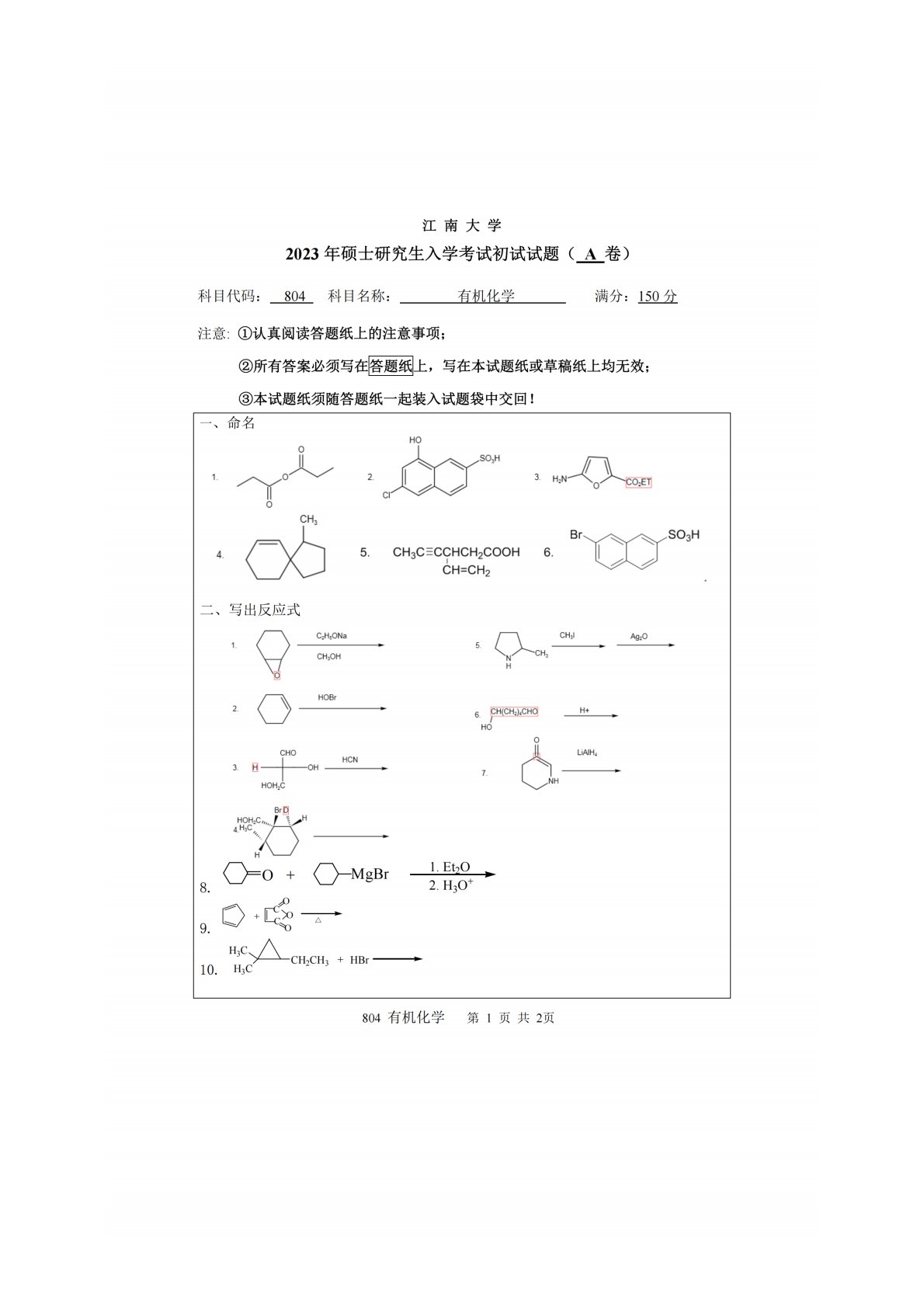江南大学804有机化学(含实验)2023年真题