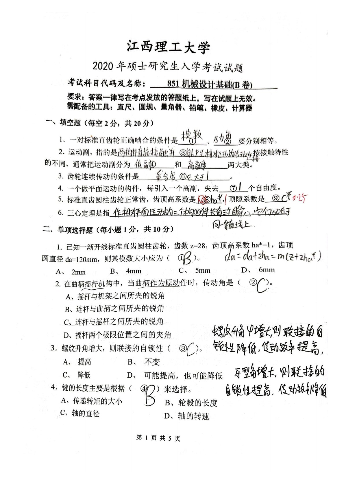 江西理工大学851机械设计基础2020年真题答案