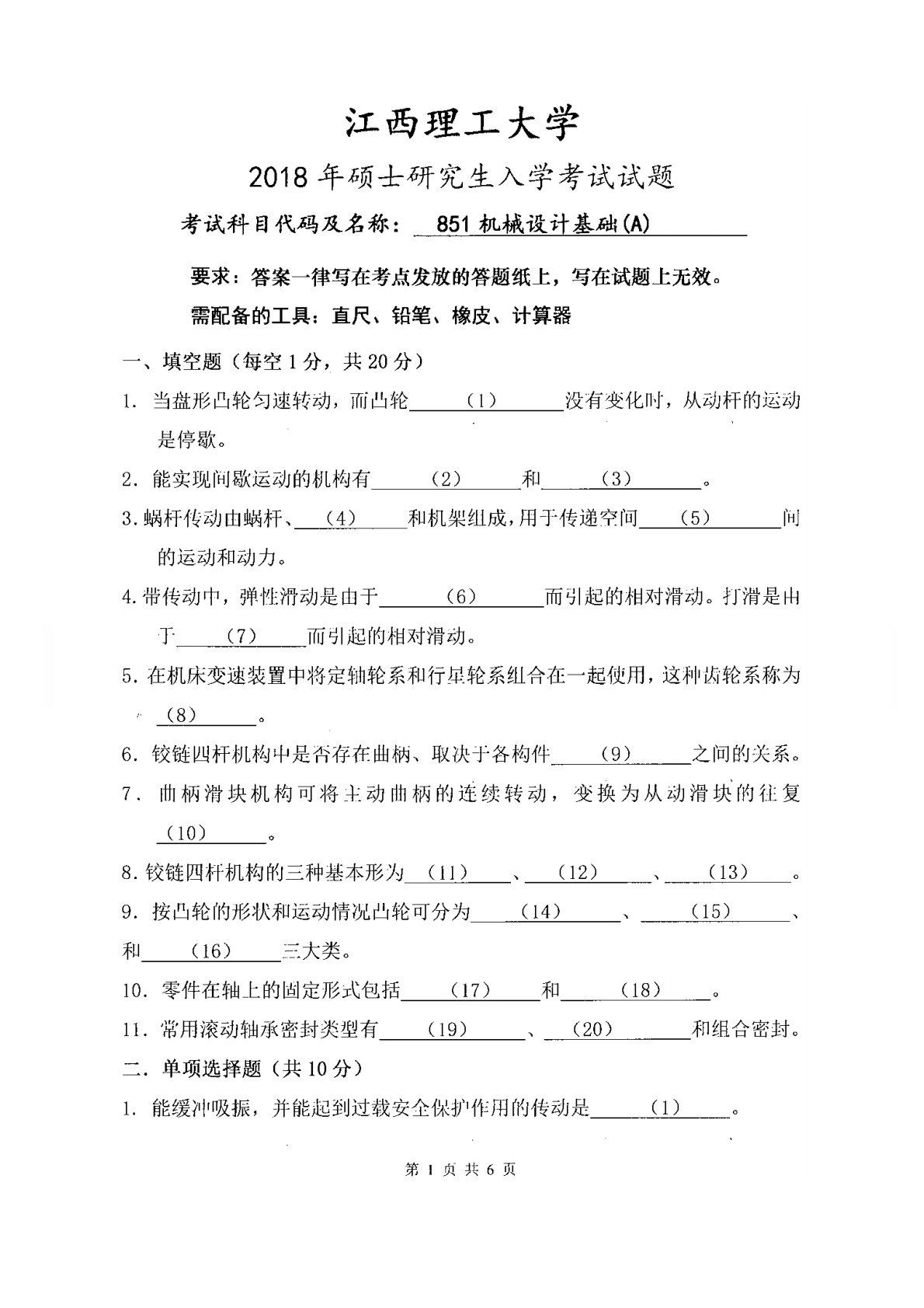 江西理工大学851机械设计基础2018年真题