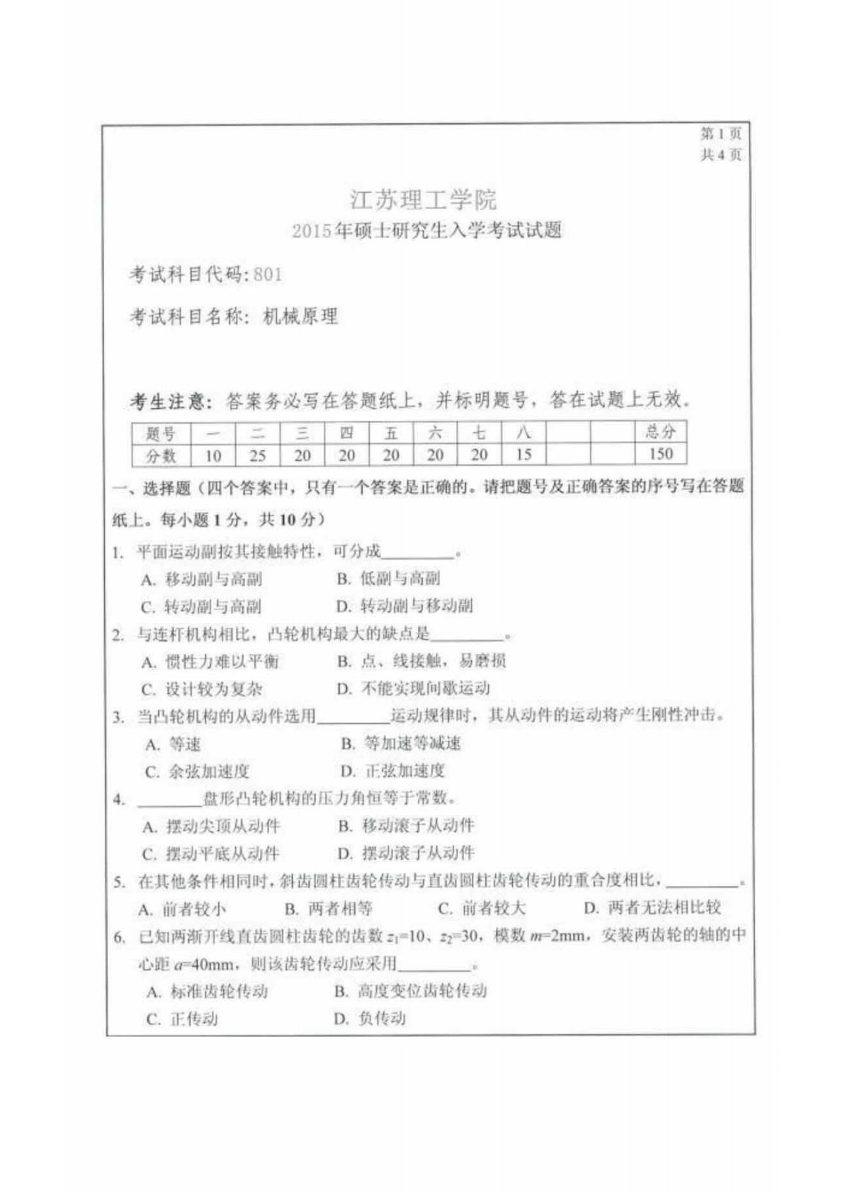江苏理工学院801机械原理2015年真题