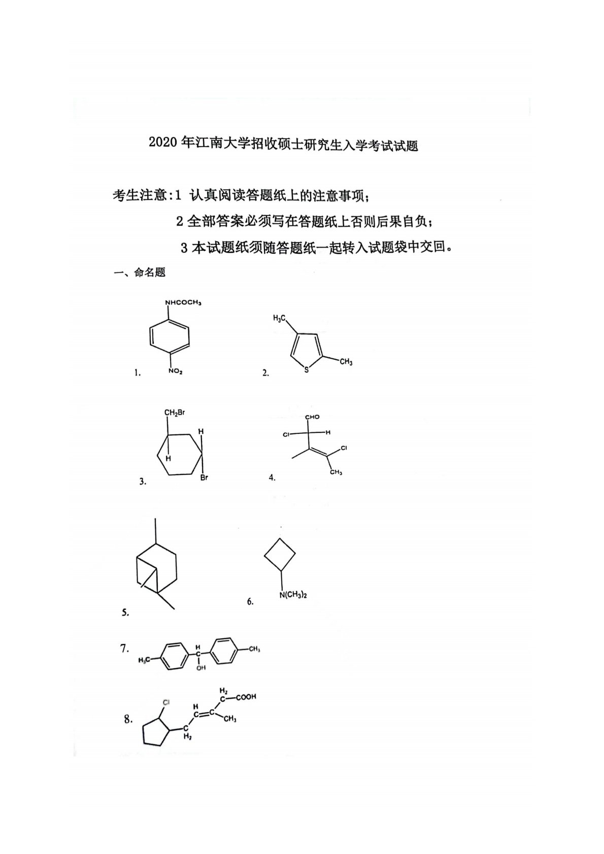 江南大学804有机化学(含实验)2020年真题