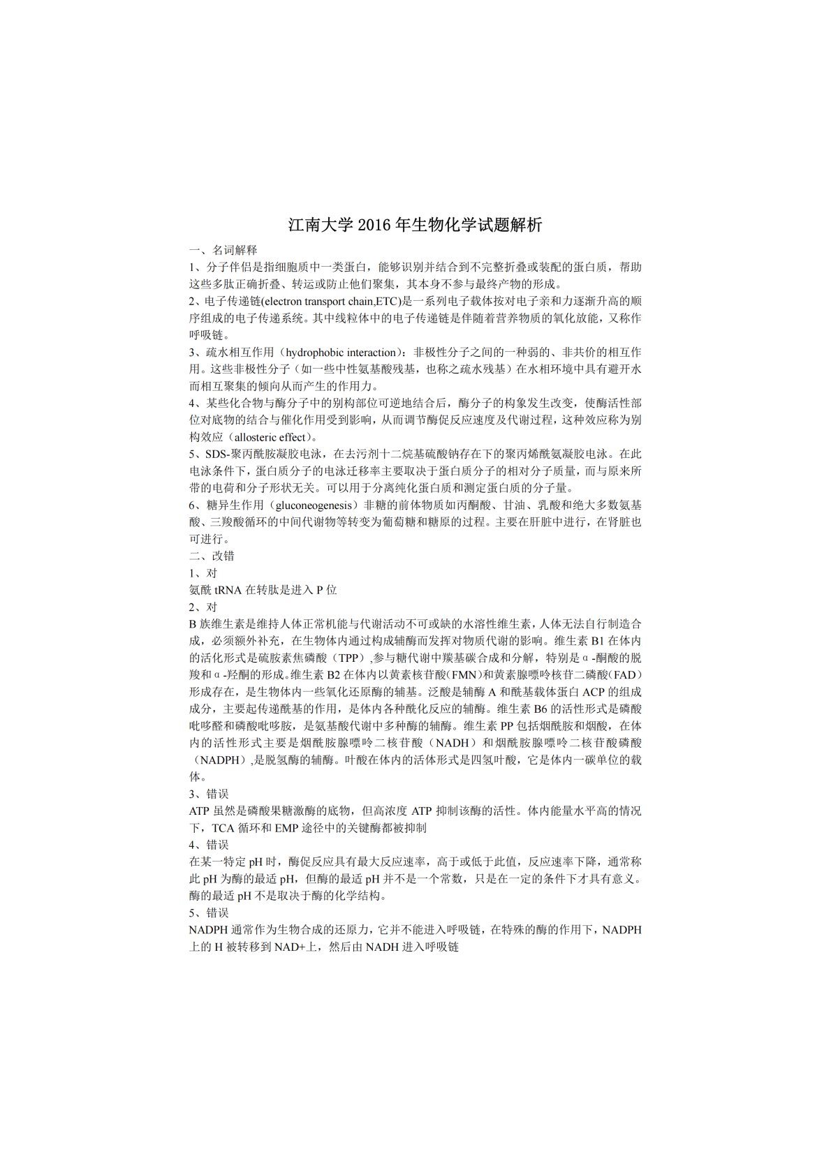 江南大学801生物化学2016年真题答案