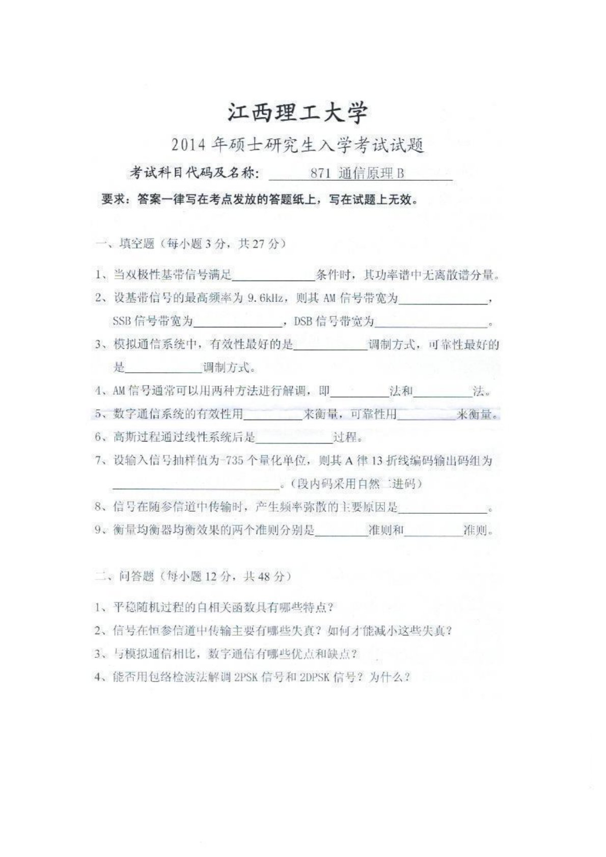 江西理工大学871通信原理2014真题及答案