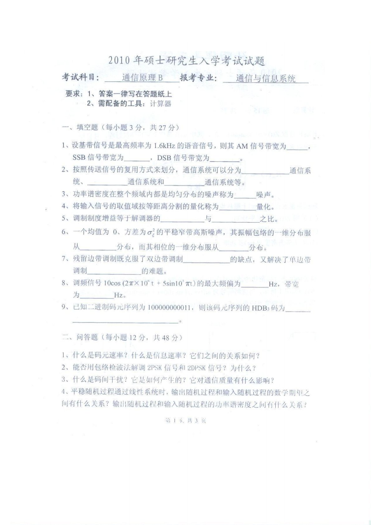 江西理工大学871通信原理2010真题及答案