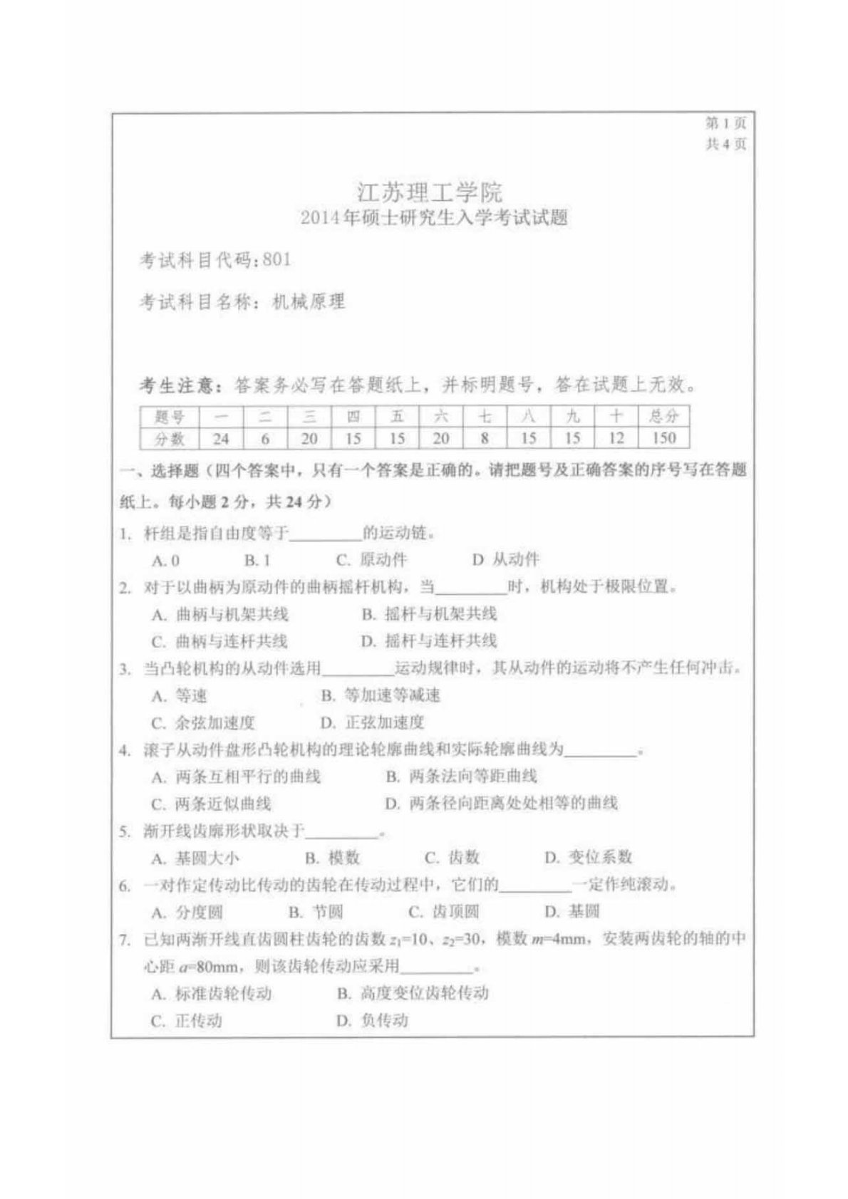 江苏理工学院801机械原理2014年真题