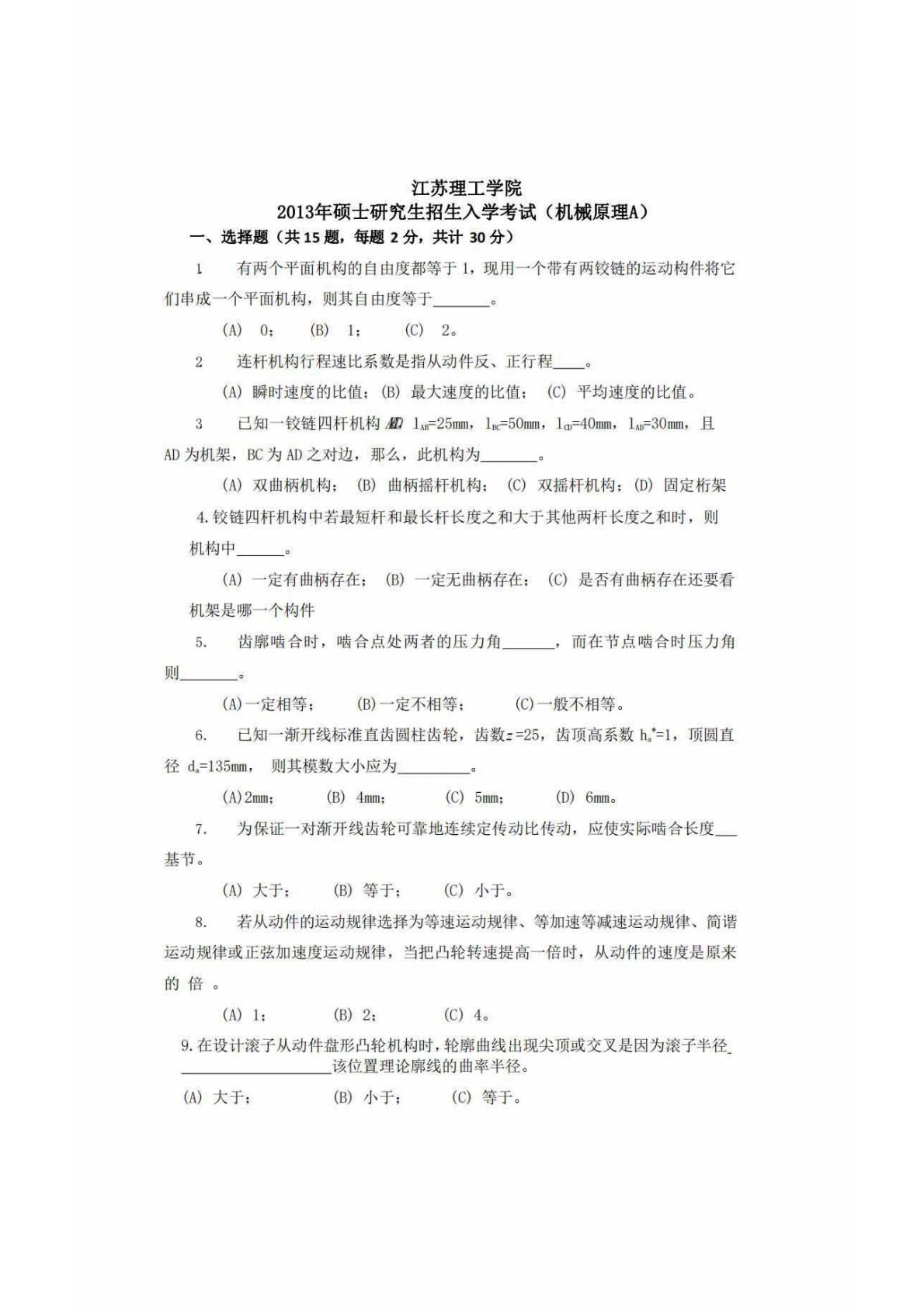 江苏理工学院801机械原理2013年真题A