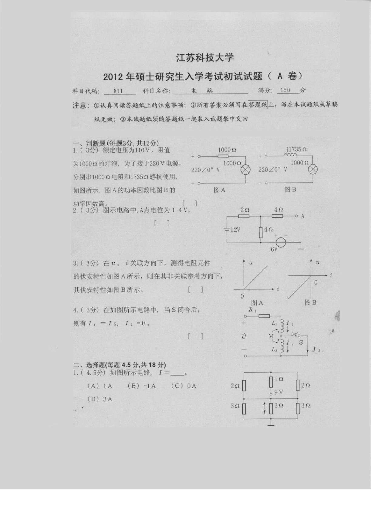 江苏科技大学2012年811电路考研真题