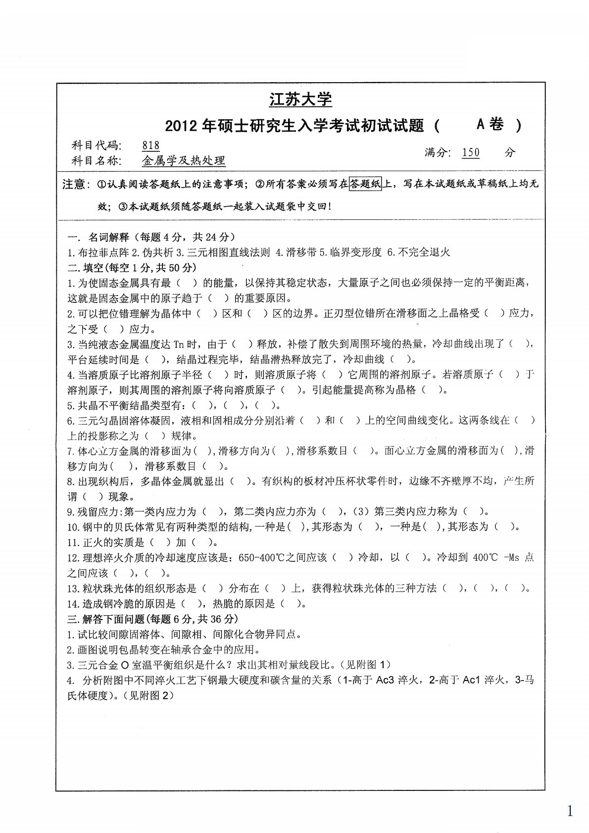 江苏大学816冶金物理化学2012年真题