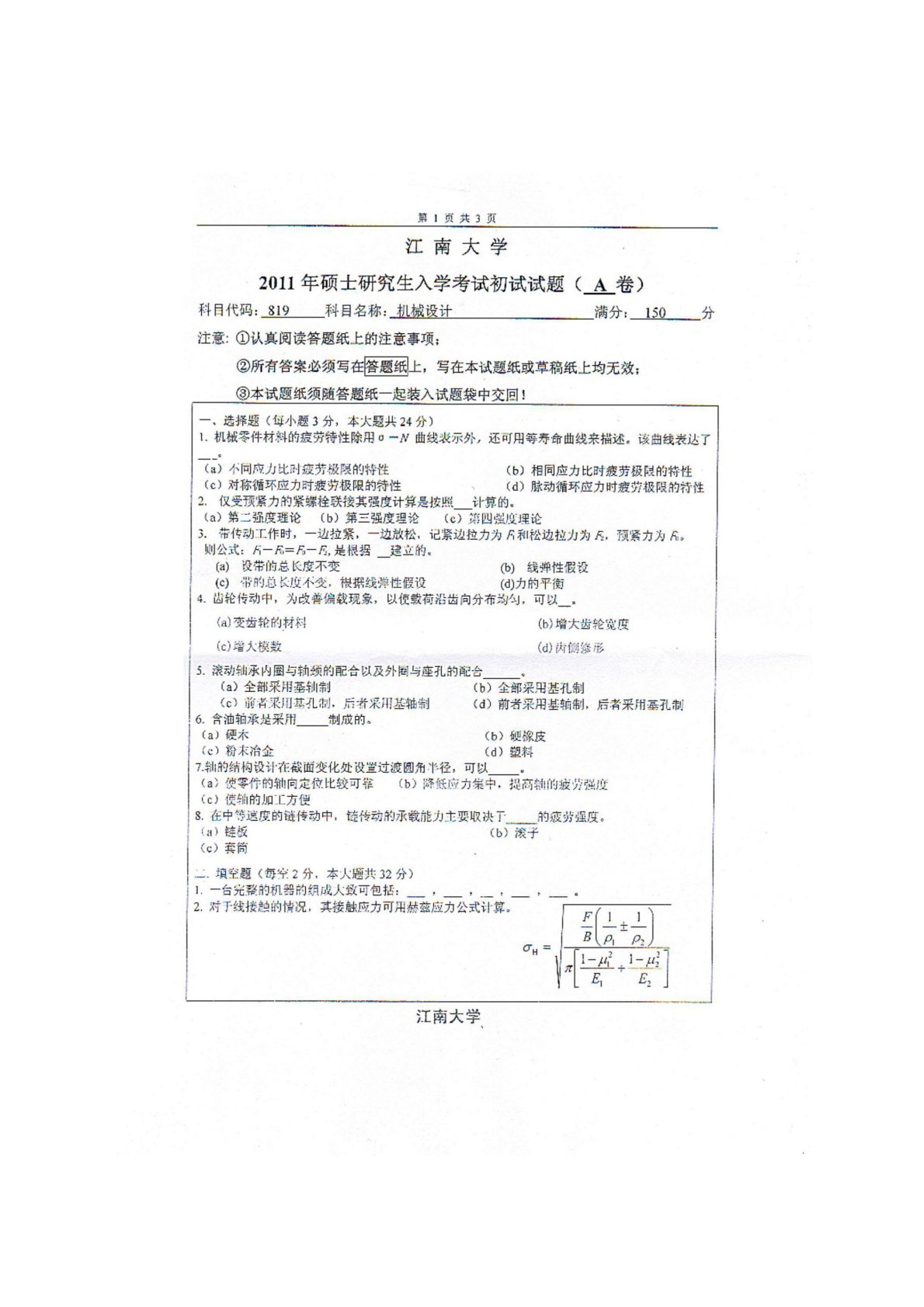 江南大学819机械设计2011年真题