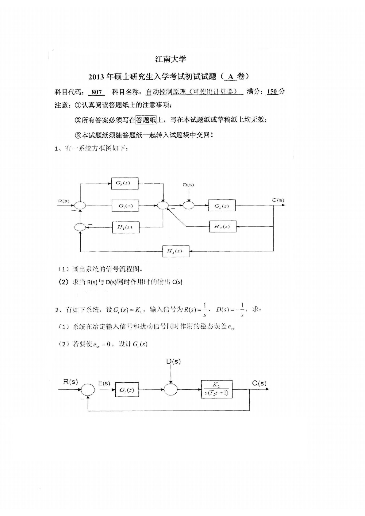 江南大学807自动控制原理2013年真题