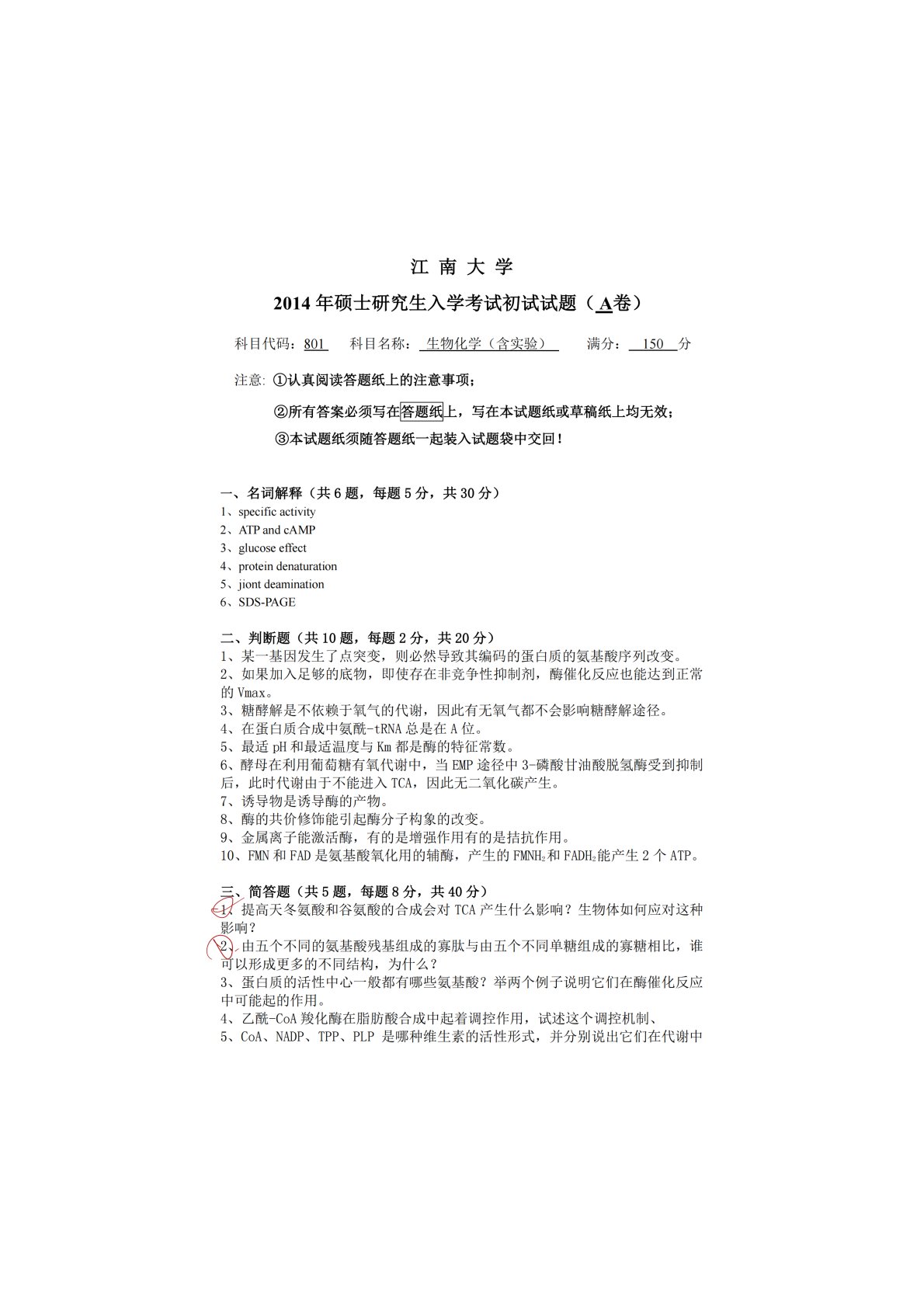 江南大学801生物化学2014年真题(1)