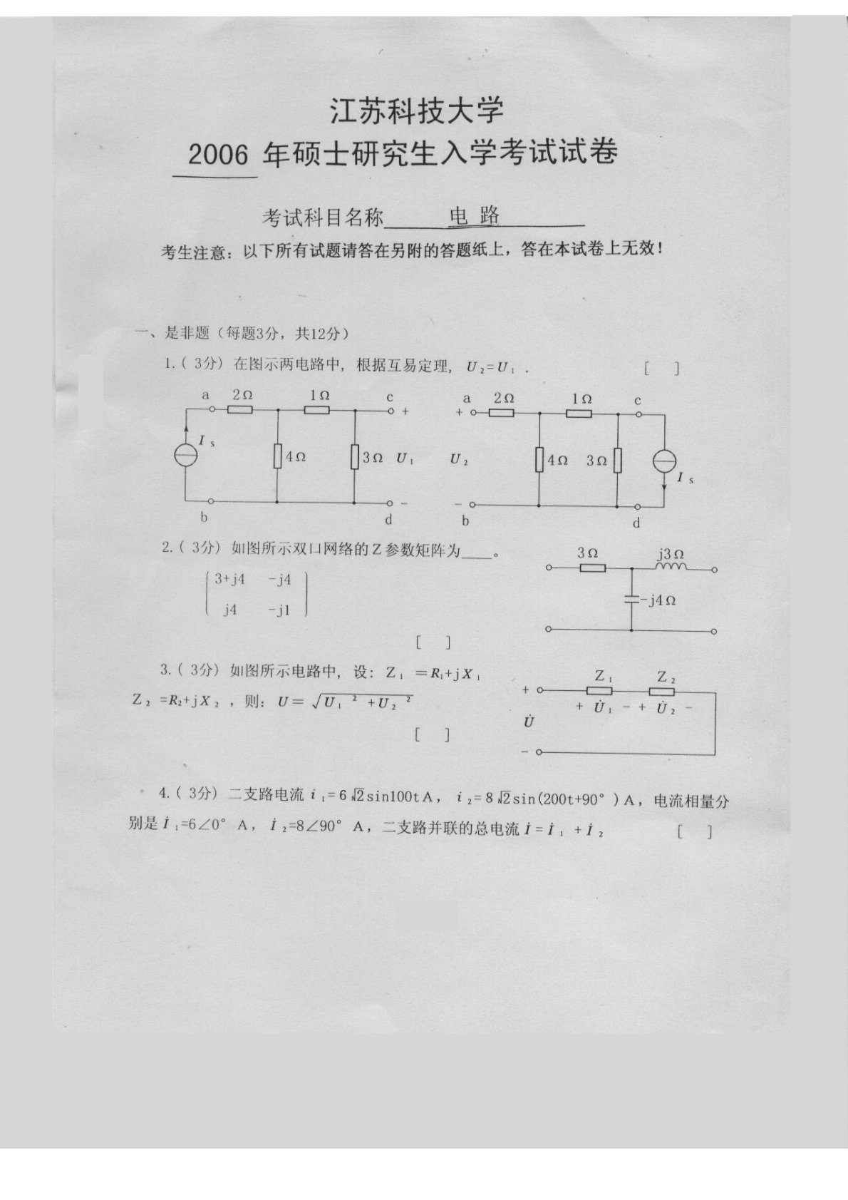 江苏科技大学2006年811电路考研真题