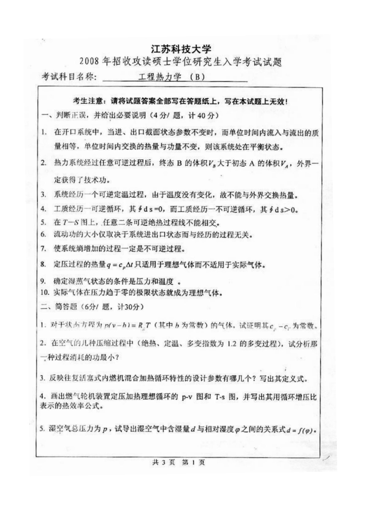 江苏科技大学806工程热力学2008年考试真题