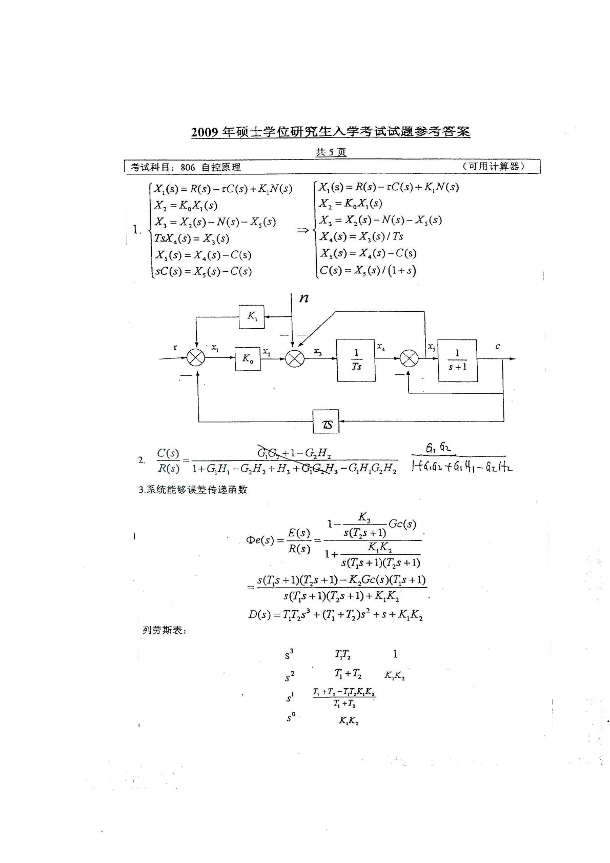 江南大学807自动控制原理2009年真题答案