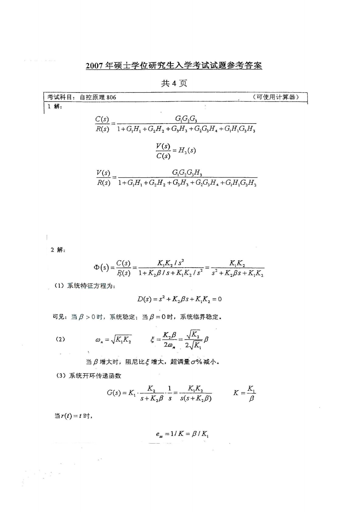 江南大学807自动控制原理2007年真题答案