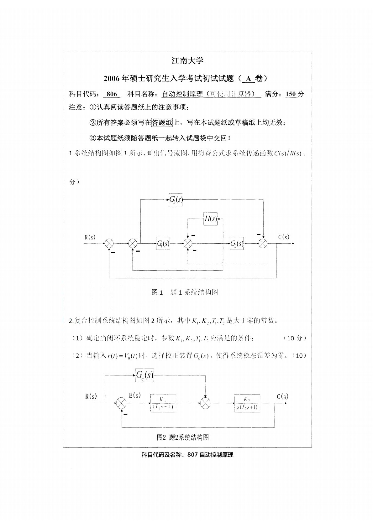 江南大学807自动控制原理2006年真题