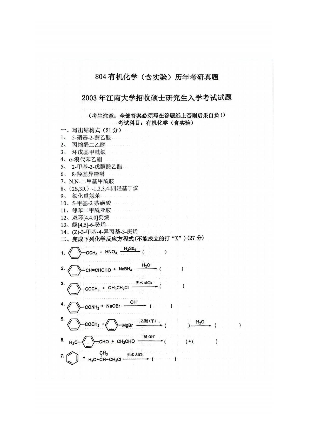 江南大学804有机化学(含实验)2003年真题