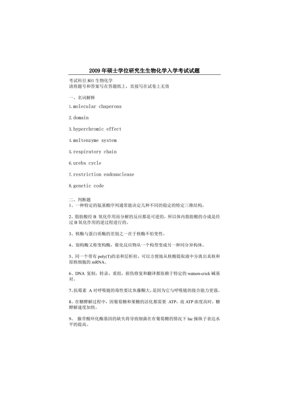 江南大学801生物化学2009年真题