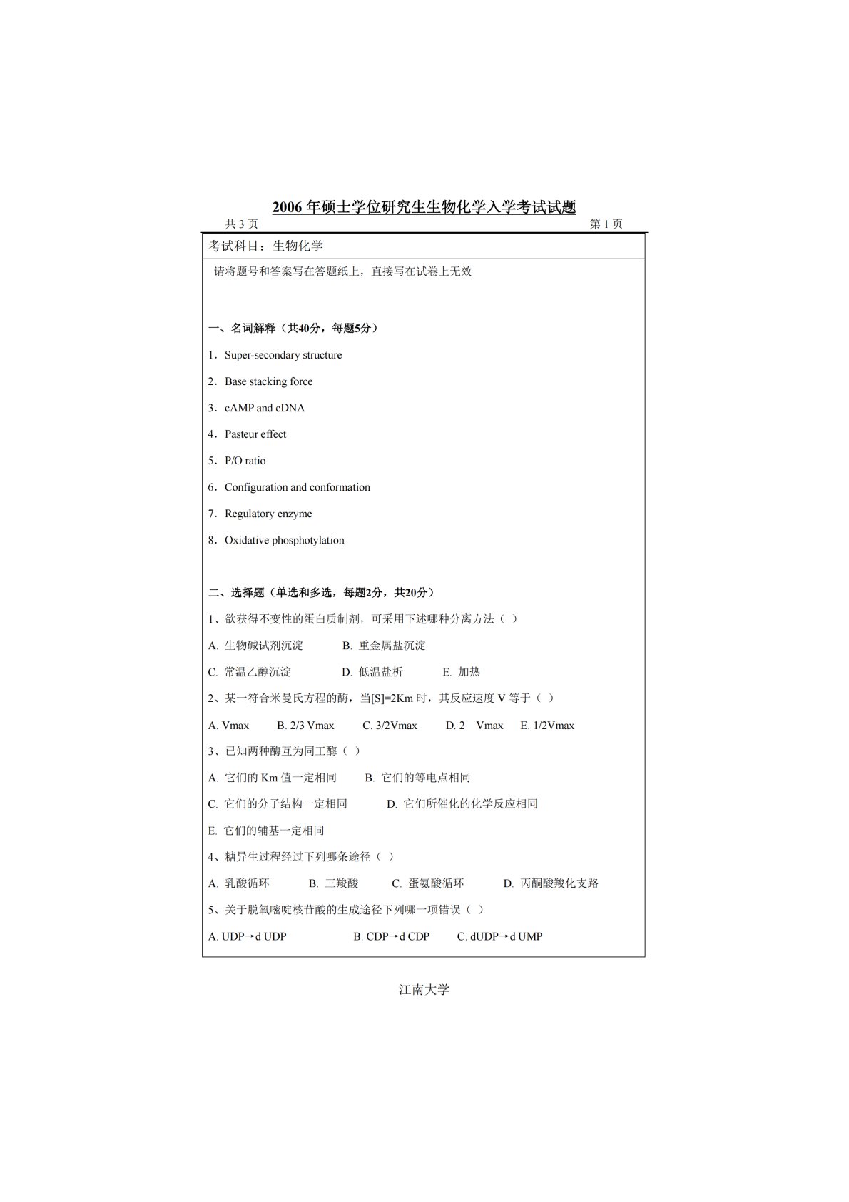江南大学801生物化学2006年真题