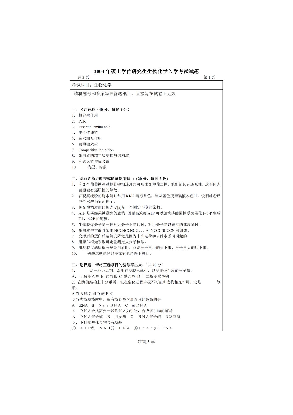 江南大学801生物化学2004年真题