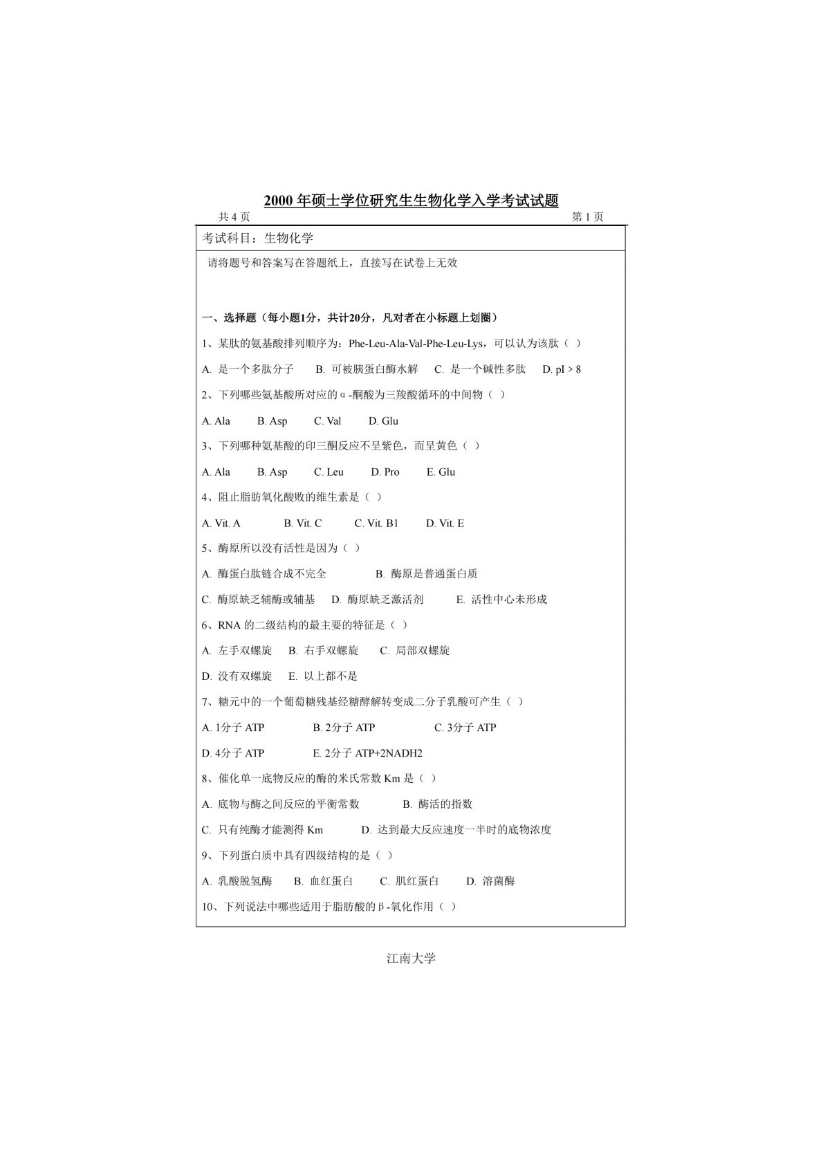 江南大学801生物化学2000年真题