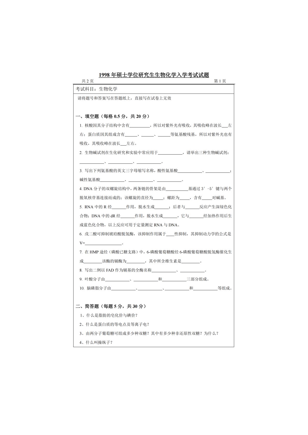 江南大学801生物化学1998年真题