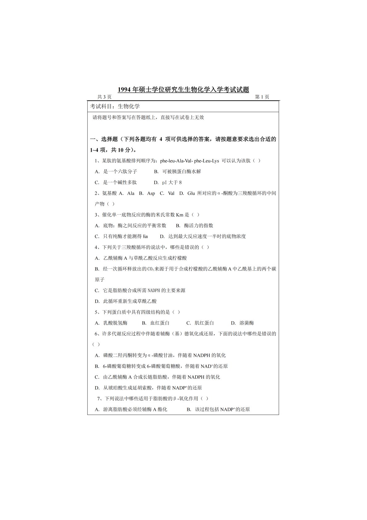 江南大学801生物化学1994年真题