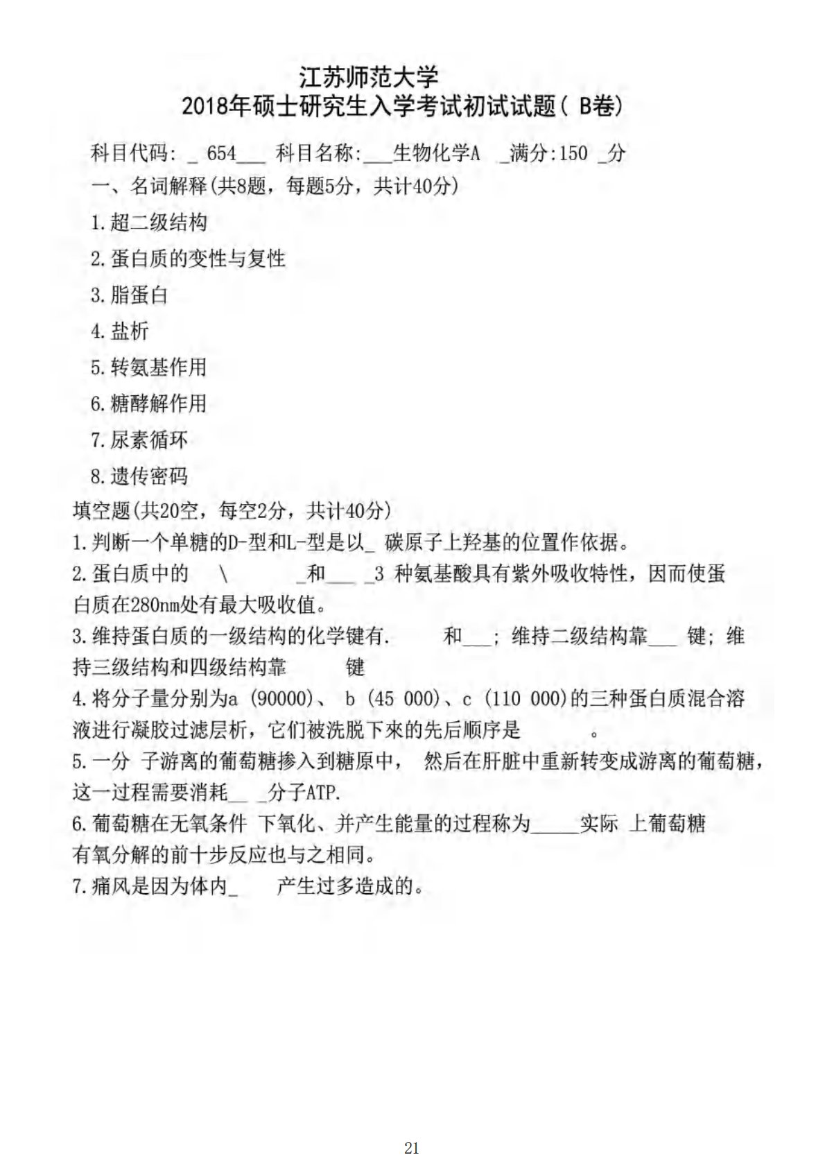 江苏师范大学654生物化学2018年真题