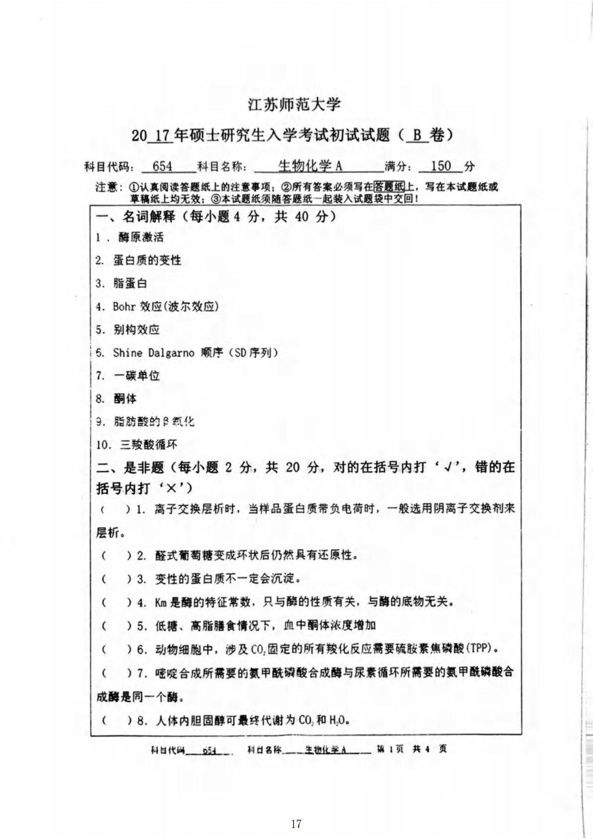 江苏师范大学654生物化学2017年真题