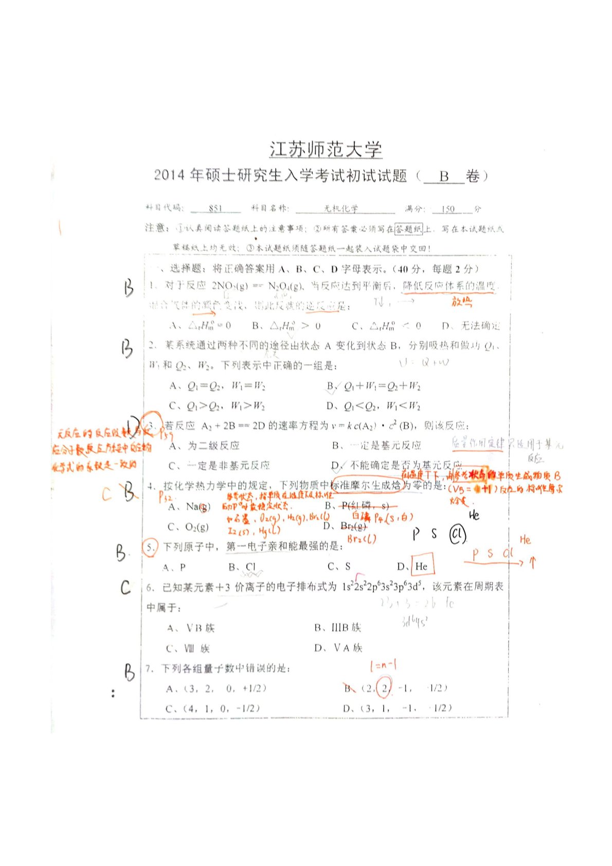 江苏师范大学大学2014年651无机化学考研真题答案解析