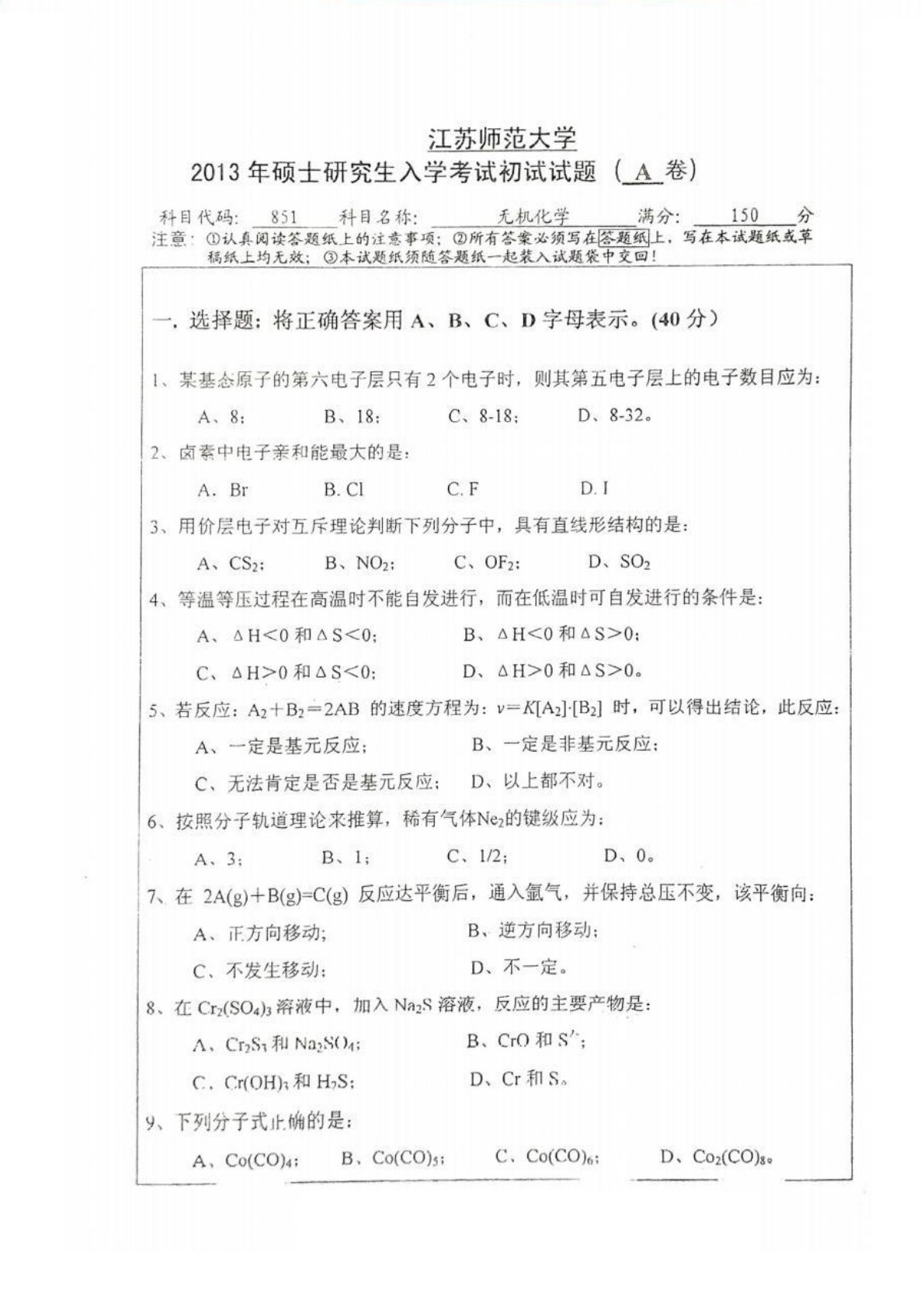 江苏师范大学大学2013年651无机化学考研真题
