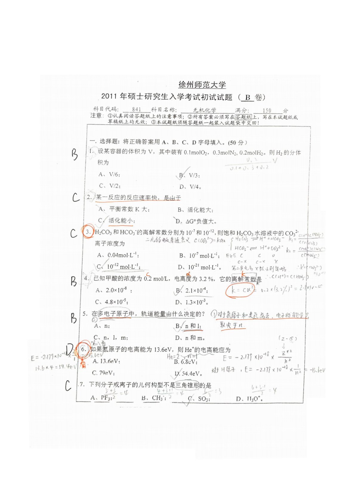 江苏师范大学大学2011年651无机化学考研真题答案解析