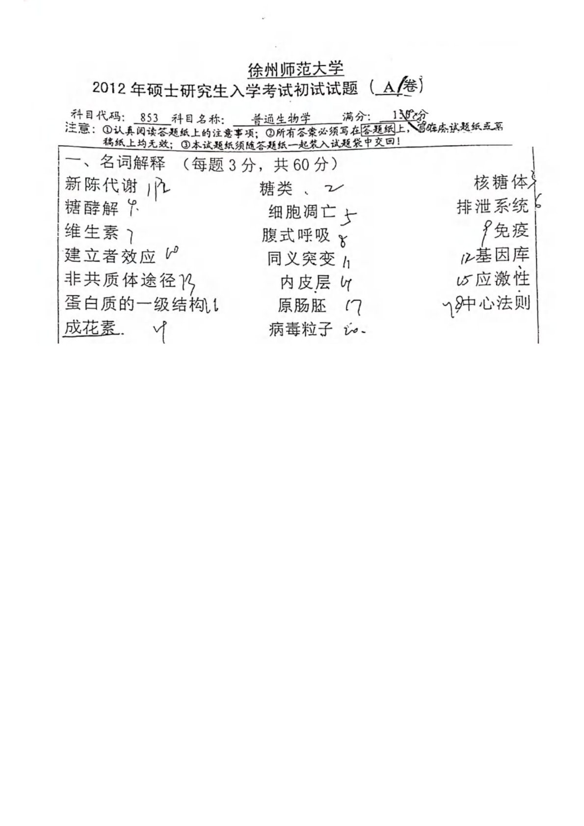 江苏师范大学2012年853普通生物学考研真题