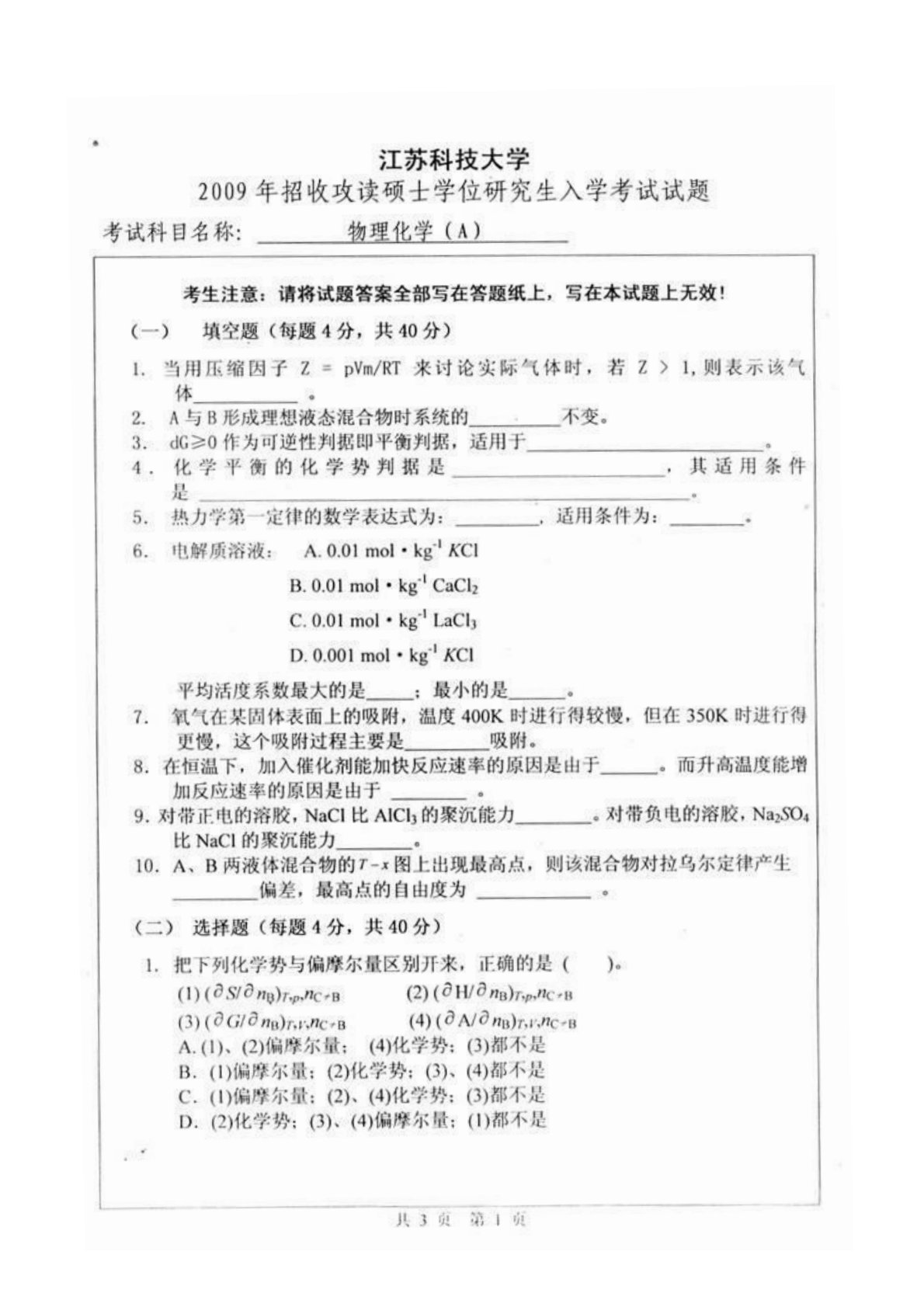 江苏科技大学837物理化学2009年考试真题