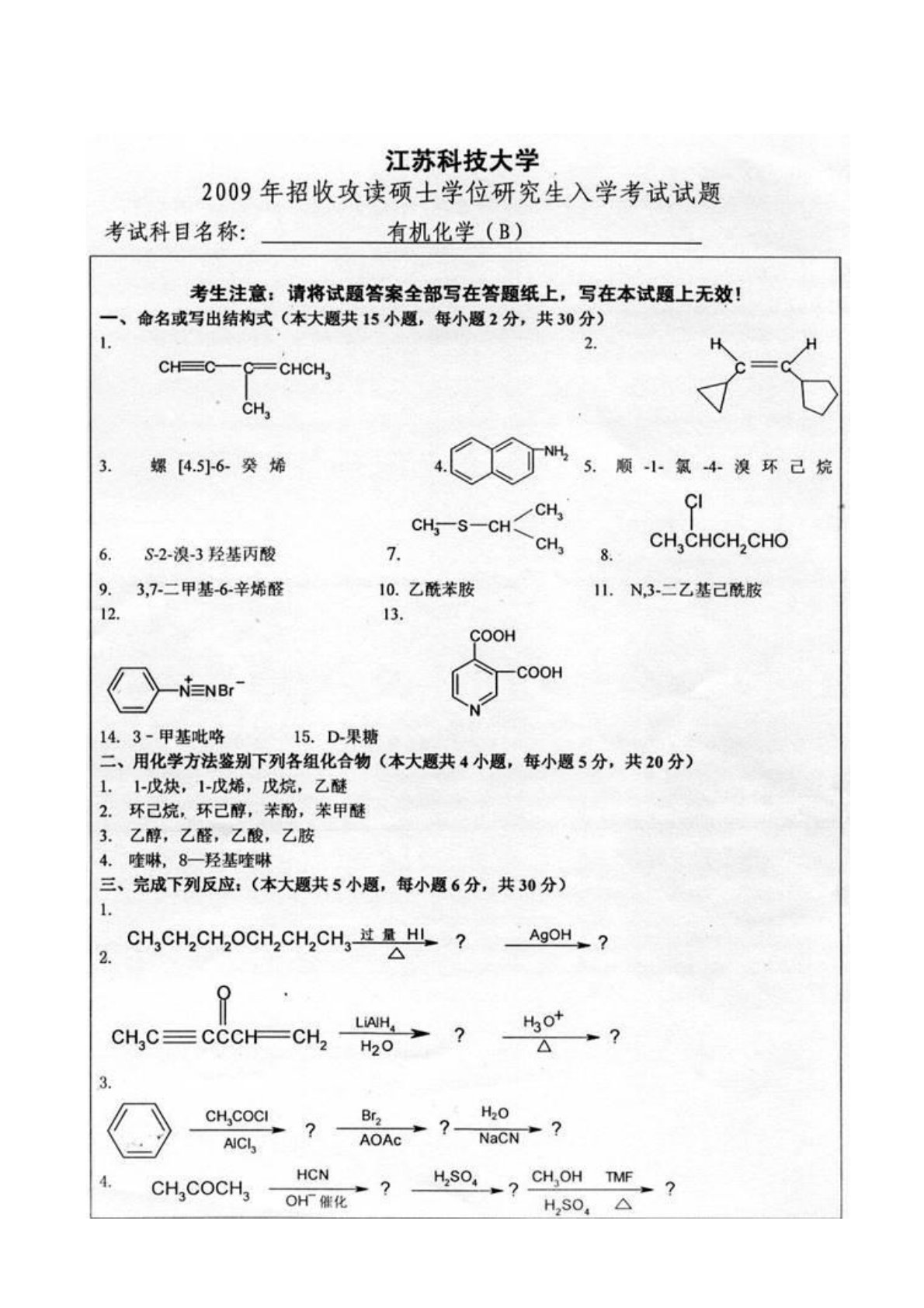 江苏科技大学614有机化学2009年考试真题