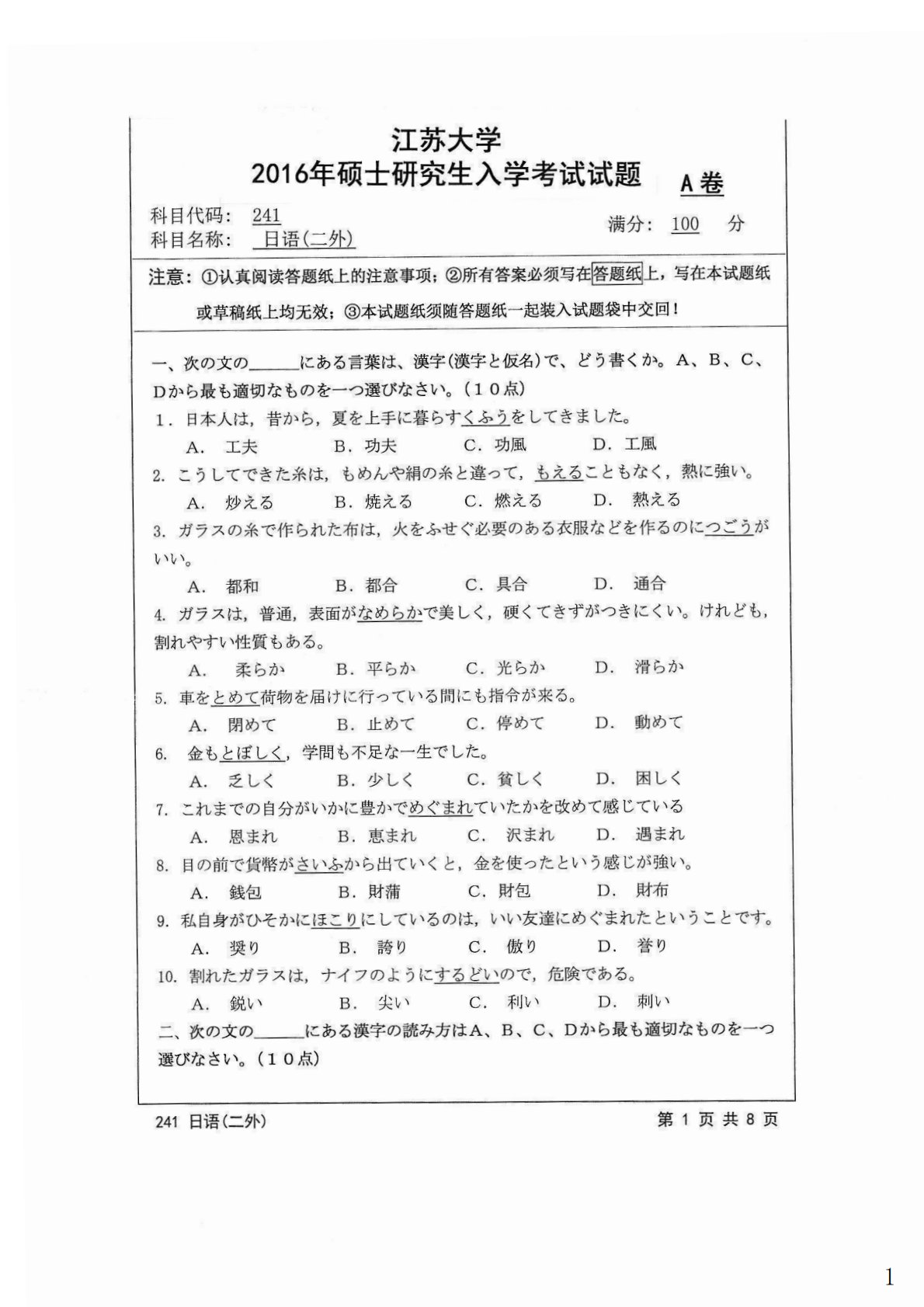 江苏大学241日语(二外)2016年真题