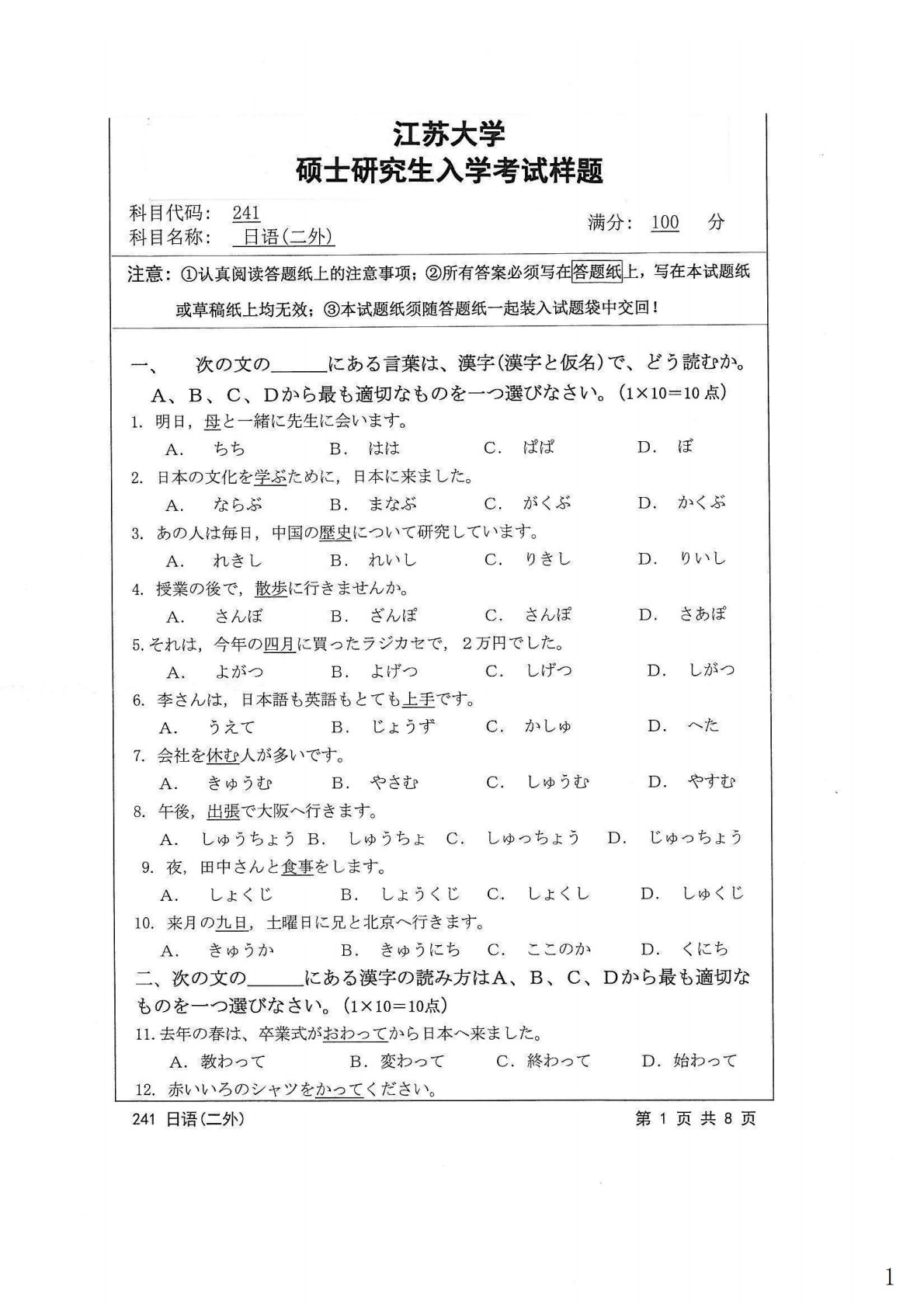 江苏大学241日语(二外)2015年真题
