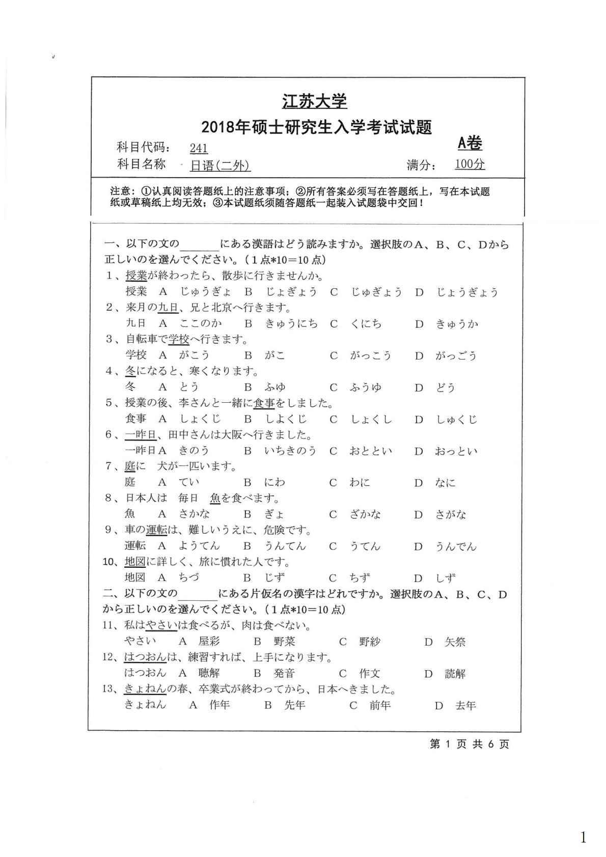 江苏大学241日语(二外)2018年真题