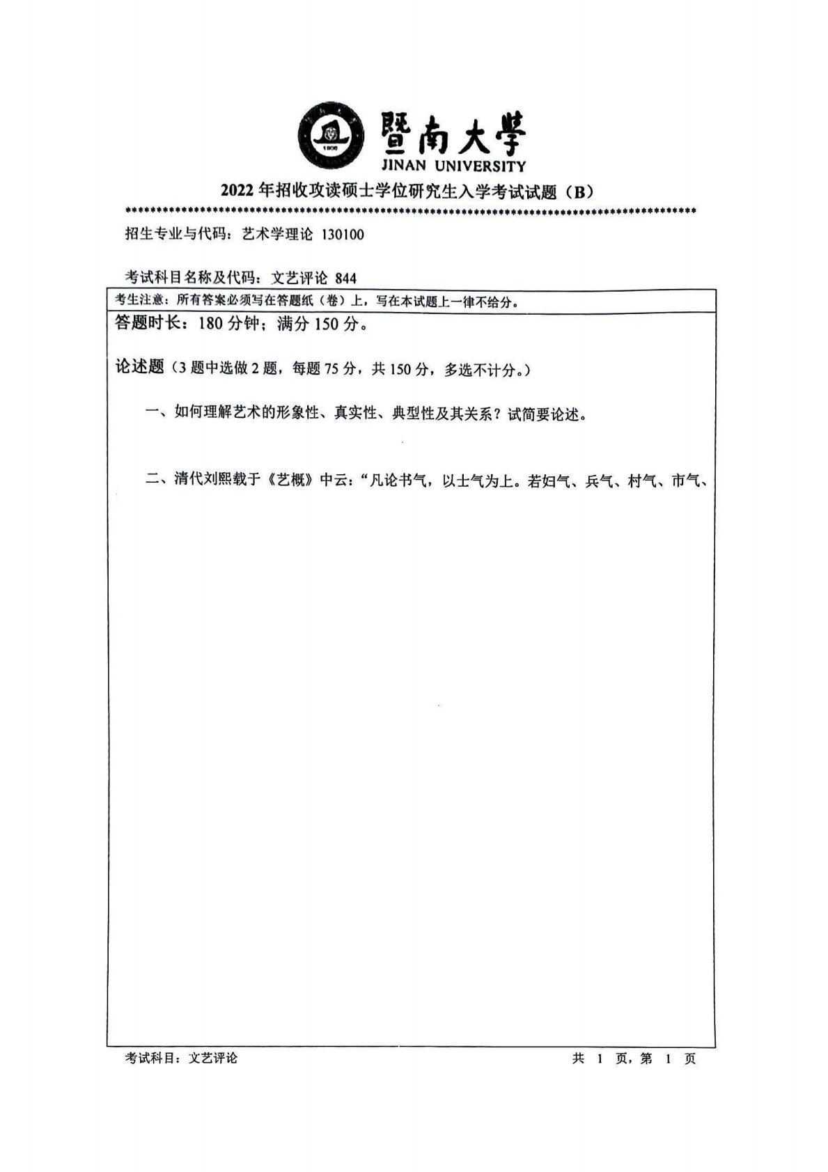 暨南大学844文艺评论2022年真题