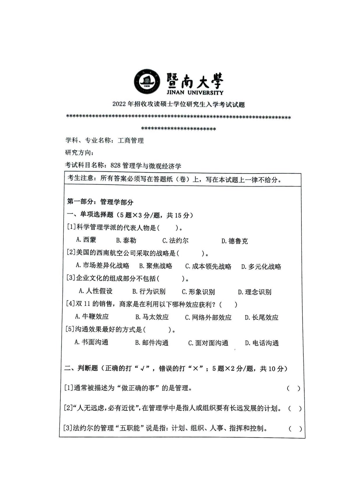 暨南大学828管理学及微观经济学2022年真题