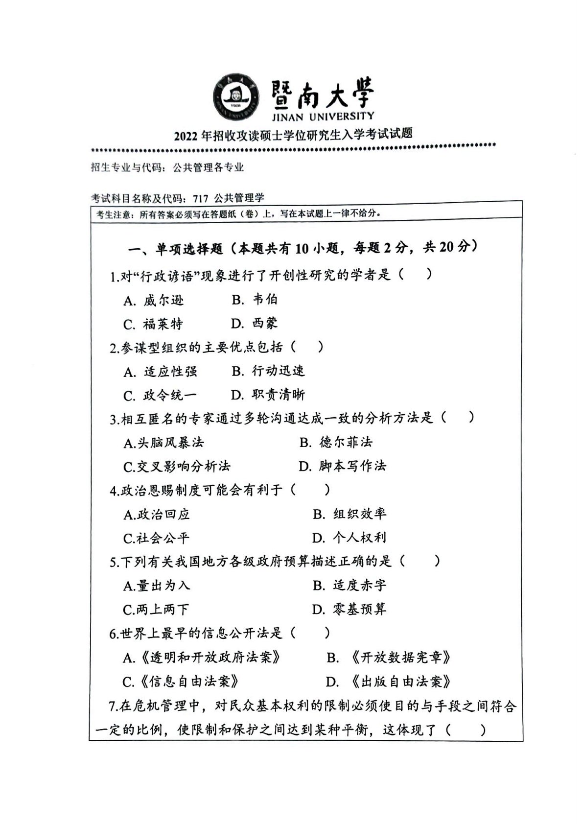 暨南大学717 公共管理学2022年真题