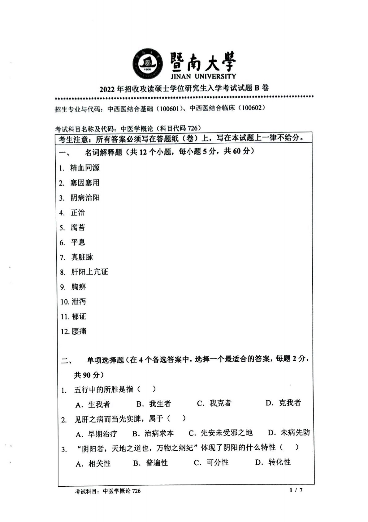 暨南大学726中医学概论2022年真题
