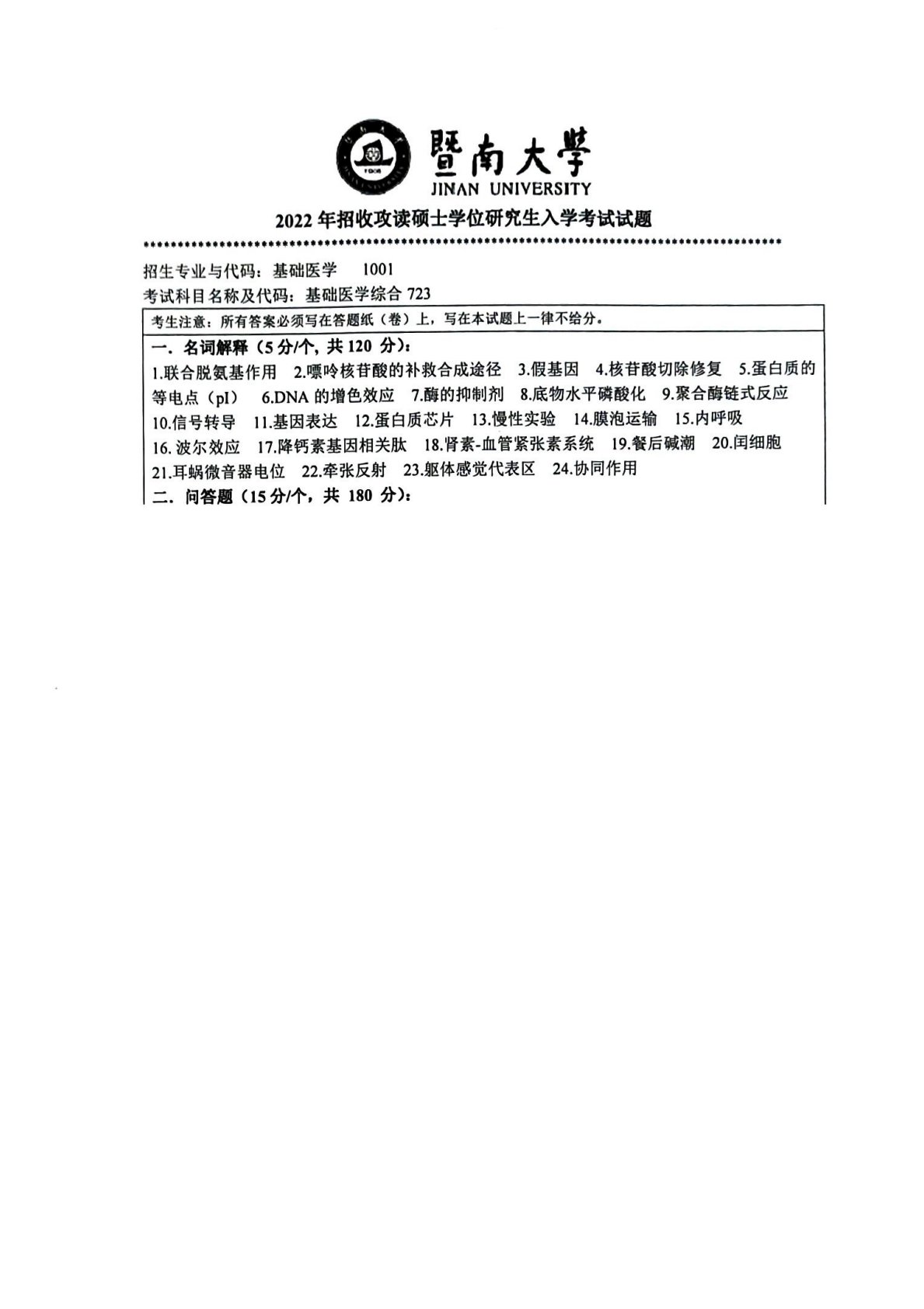 暨南大学723基础医学综合2022年真题