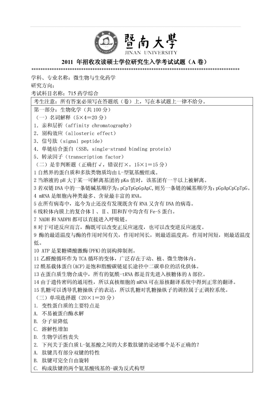 暨南大学349药学综合2011年真题
