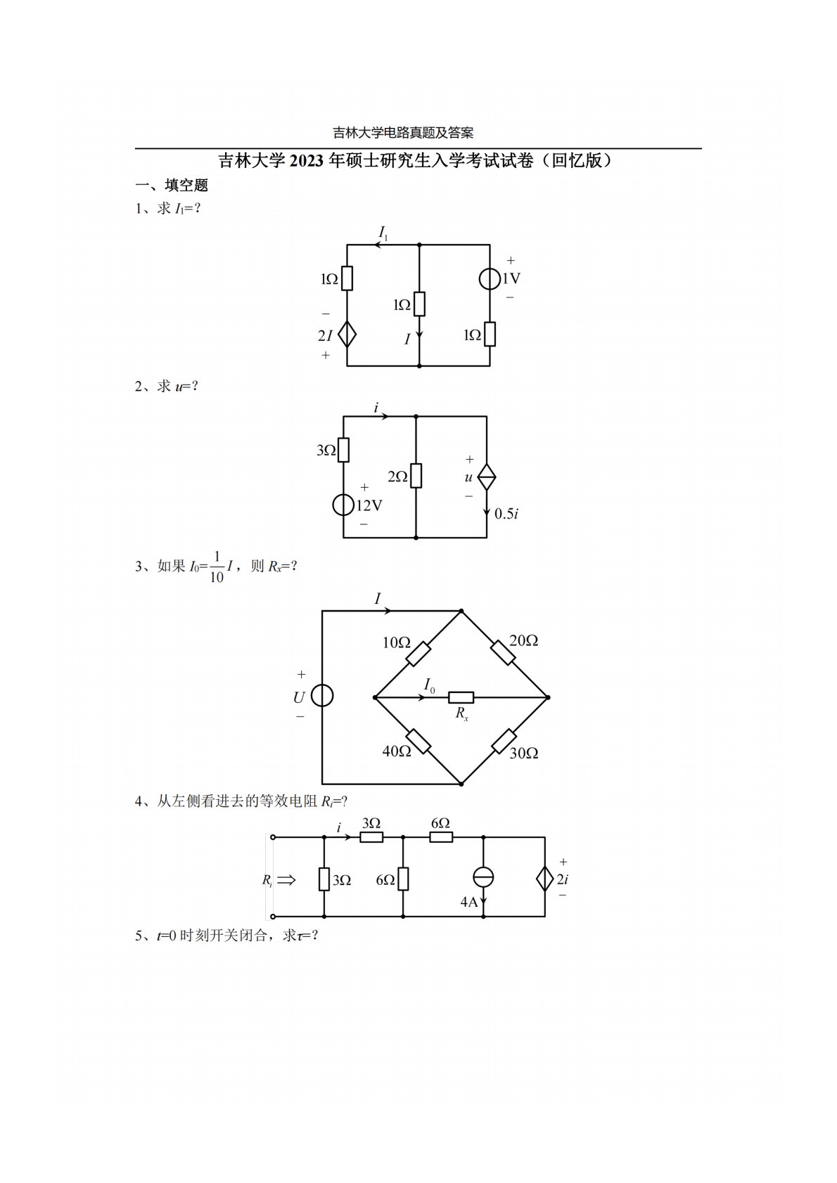 吉林大学848电路原理2023年真题回忆版