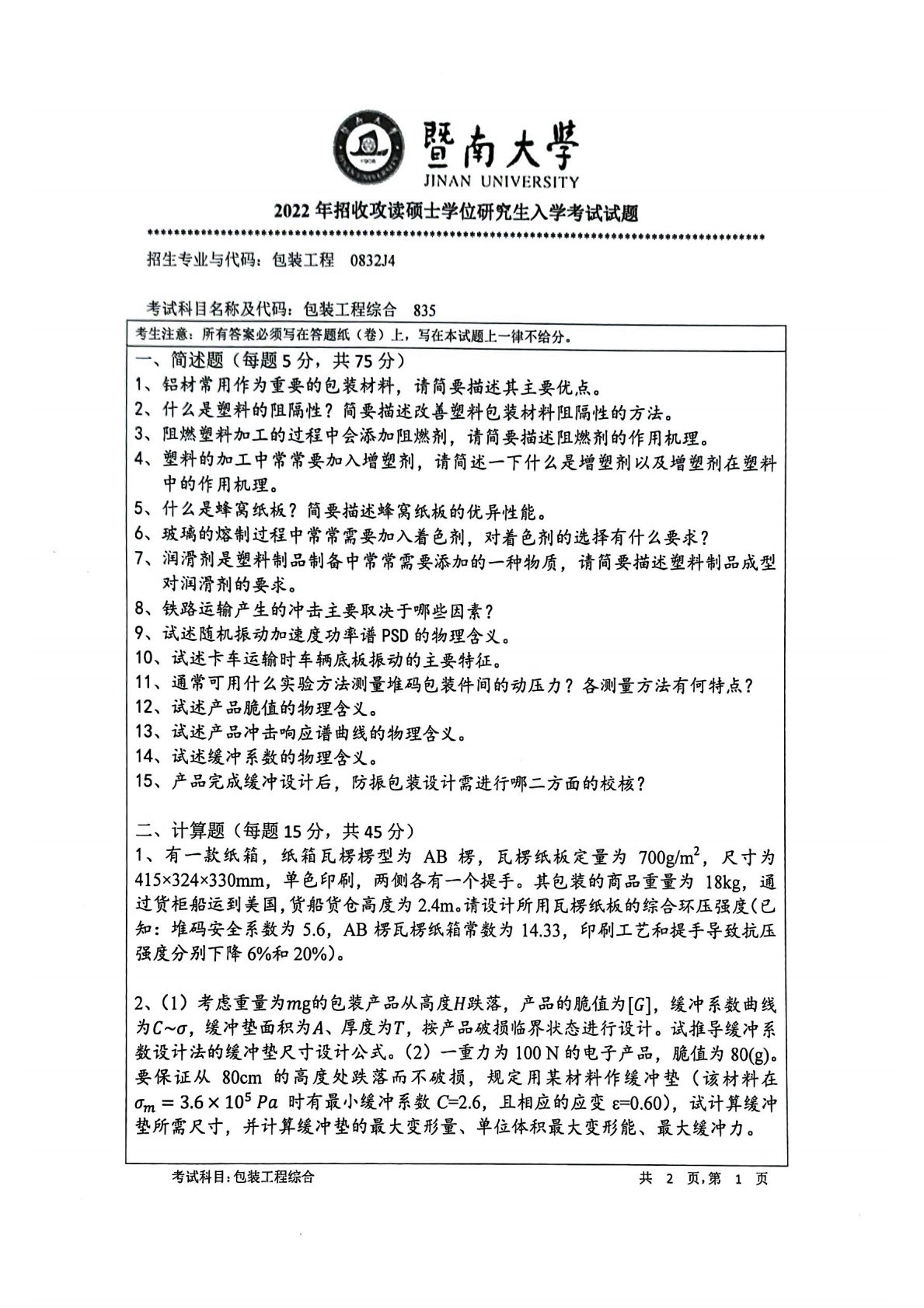 暨南大学835包装工程综合2022年真题