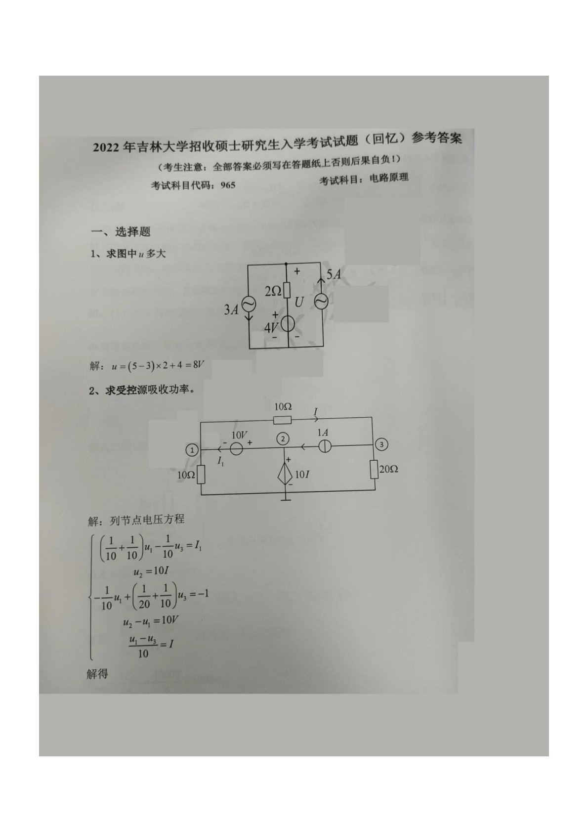 吉林大学848电路原理2022年真题及答案